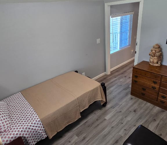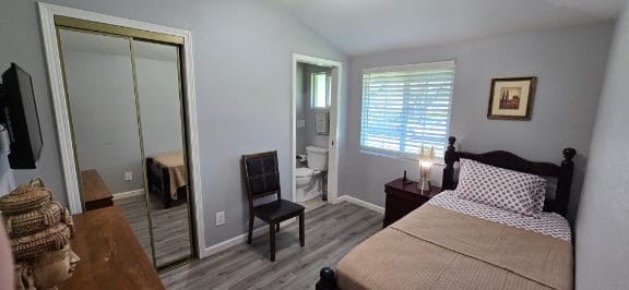 Room 1 offers a peaceful, sunlit environment that’s perfect for rest and comfort. Positioned near the front of the home, it features a large window for natural light and a private closet with mirrored doors. The wall-mounted TV and inviting neutral decor make it feel cozy and welcoming. This room is ideal for residents who enjoy a calming, familiar atmosphere and easy access to common areas.
