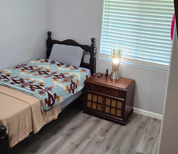 Room 2 is situated near the heart of the home, offering quick access to the kitchen, dining area, and main hallway. Connected by a shared bathroom to Room 1, it’s a convenient and cozy space that balances accessibility with comfort. The room features a twin bed with fresh linens, a mounted TV, and a window that lets in soft natural light throughout the day. Its location makes it especially ideal for residents who enjoy staying close to the daily rhythm of the home.